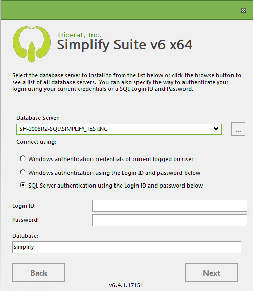The following example configures a Simplify Suite installation to use SQL Server host TRICERAT-SQLDB and port number 11119: